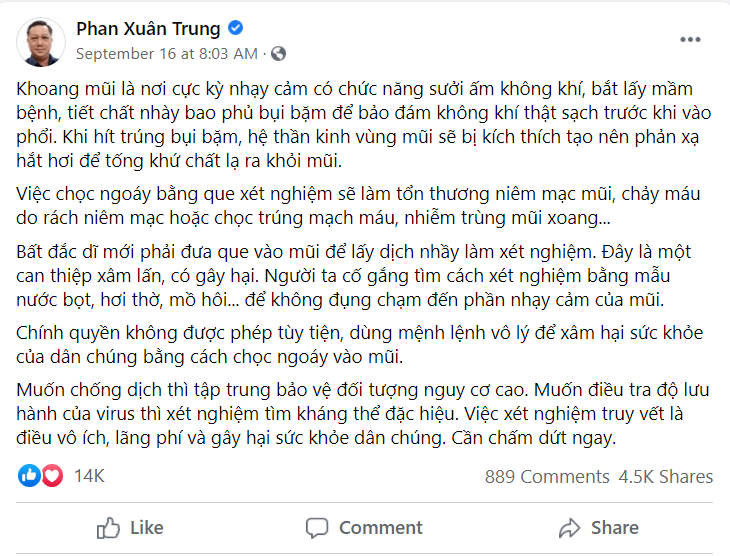 Còn 1 điều nữa đó chính là sự tổn thương bên trong khoang mũi. Bác sĩ Phan Xuân Trung đã lên tiếng cảnh báo về việc đưa que test vào bên trong khoang mũi sẽ khiến tổn thương niêm mạc mũi. Mời mọi người đọc.