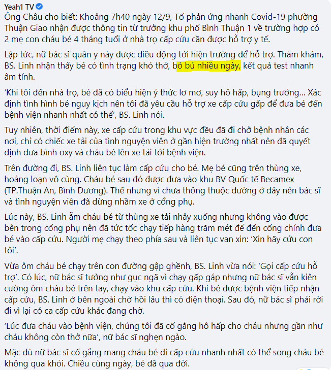 Tôi có đọc qua một bài báo tôi thấy rất bức xúc vì một đứa bé 4 tháng tuổi qua đời. Trong bài báo thì nói bé chết dù đã được hô hấp, nhưng cá nhân tôi thấy thì không phải chết vì khó thở. Bài báo không ghi rõ bé chết vì lý do nào, nhưng mọi thấy chỗ tôi highlight không? Tôi nghi ngờ bé chết vì đói chứ không phải cái gì khác hết. Như mọi người thấy trong mùa dịch, mọi người không được hỗ trợ đàng hoàng cả. Những thứ mà mọi người nhận được chỉ là mì gói, trứng, dầu ăn, v.v. Mọi người đọc ở đường link này sẽ rõ https://hauduenamviet.wordpress.com/2021/09/09/su-kim-kep-trong-mua-dich-tai-viet-nam/